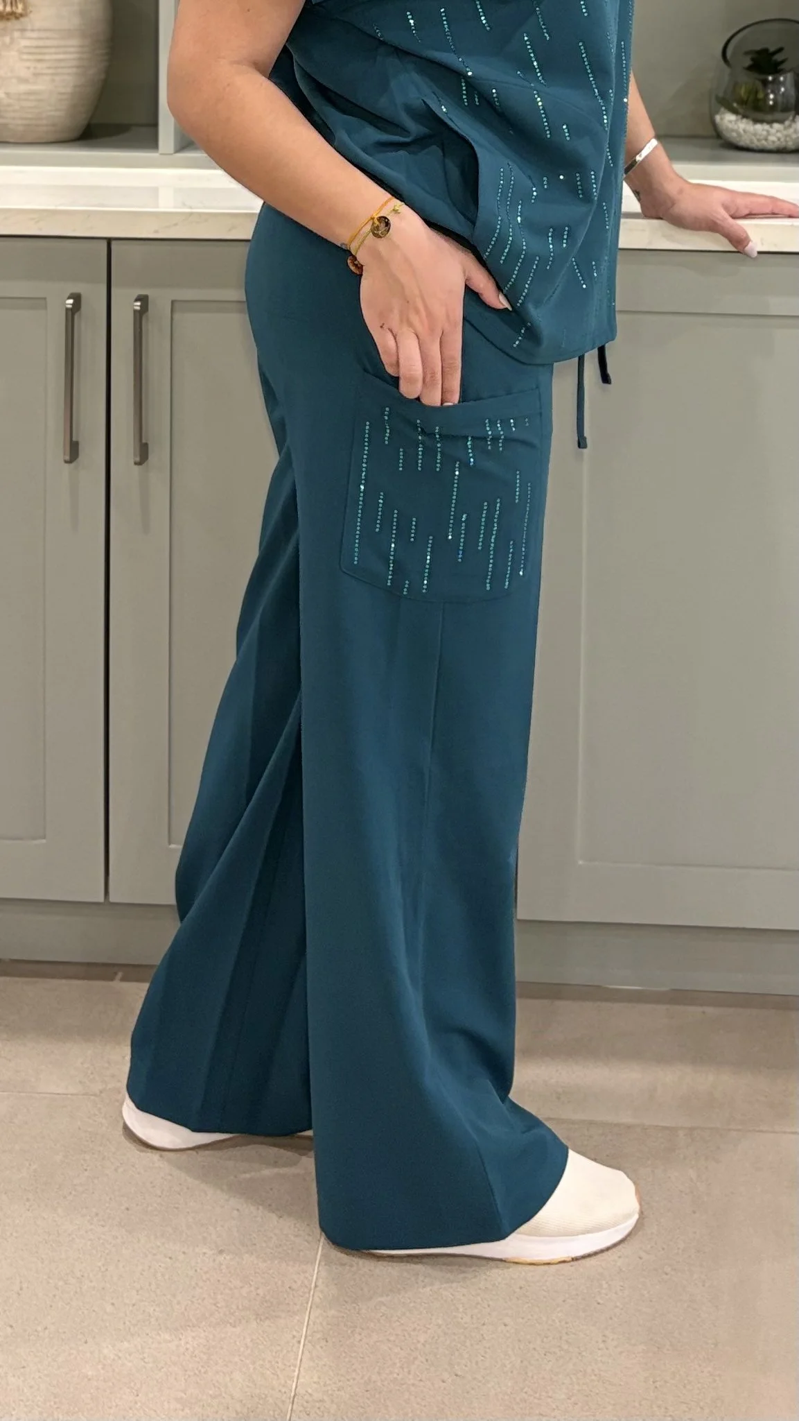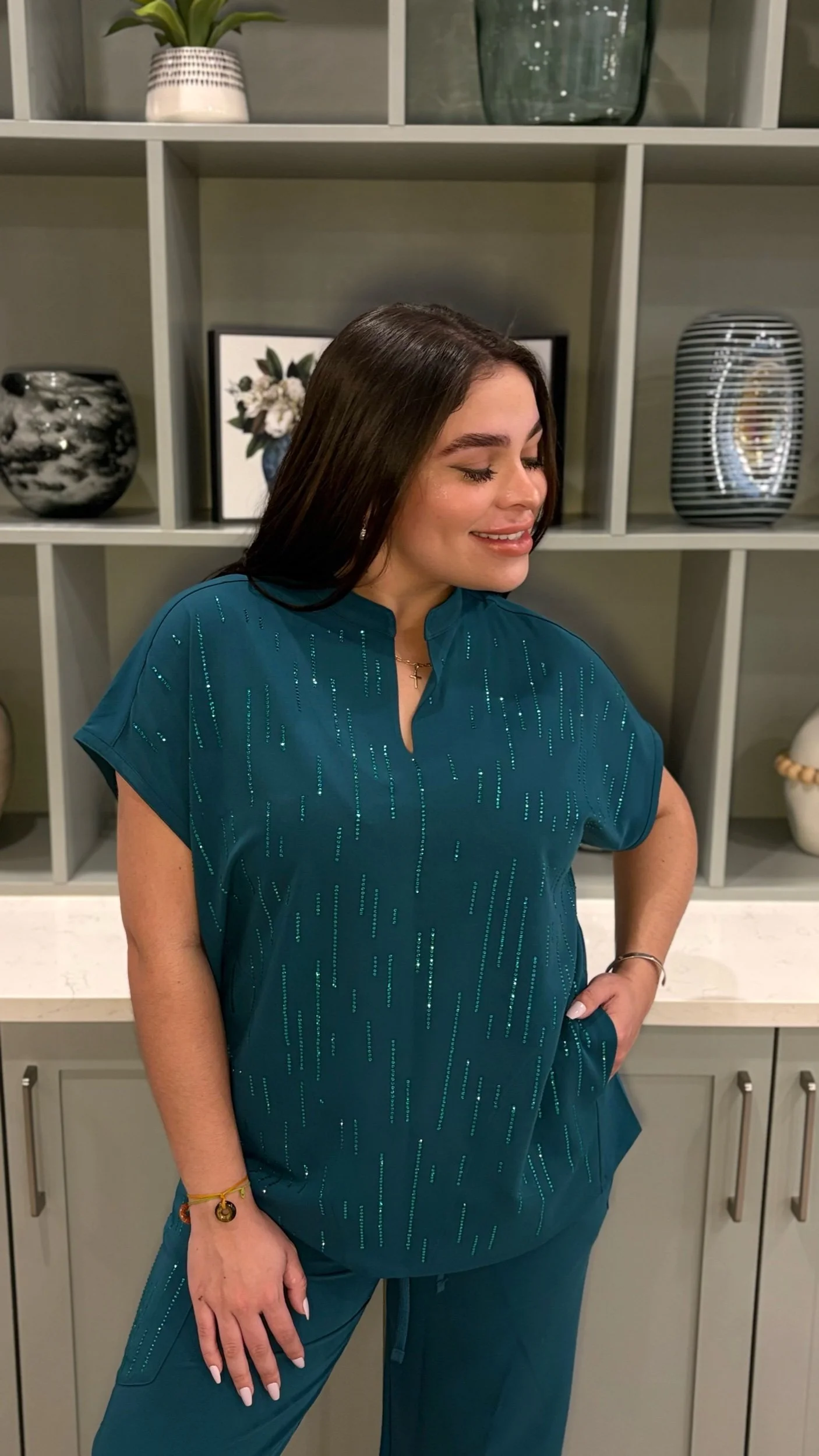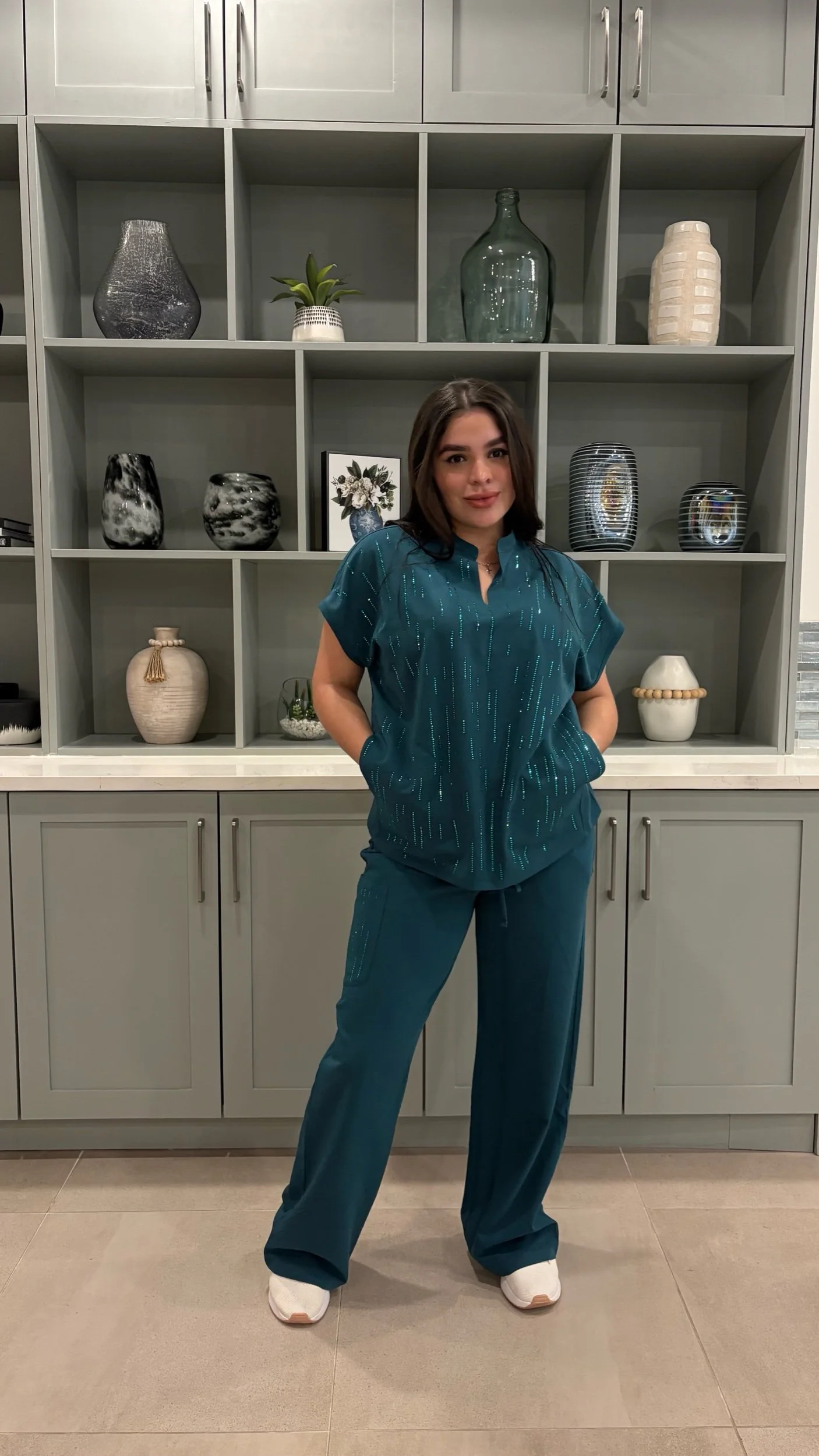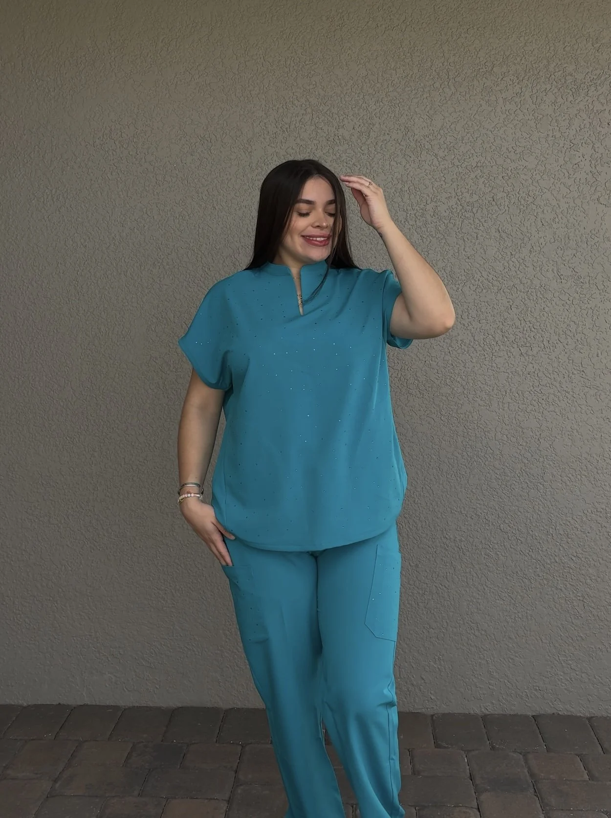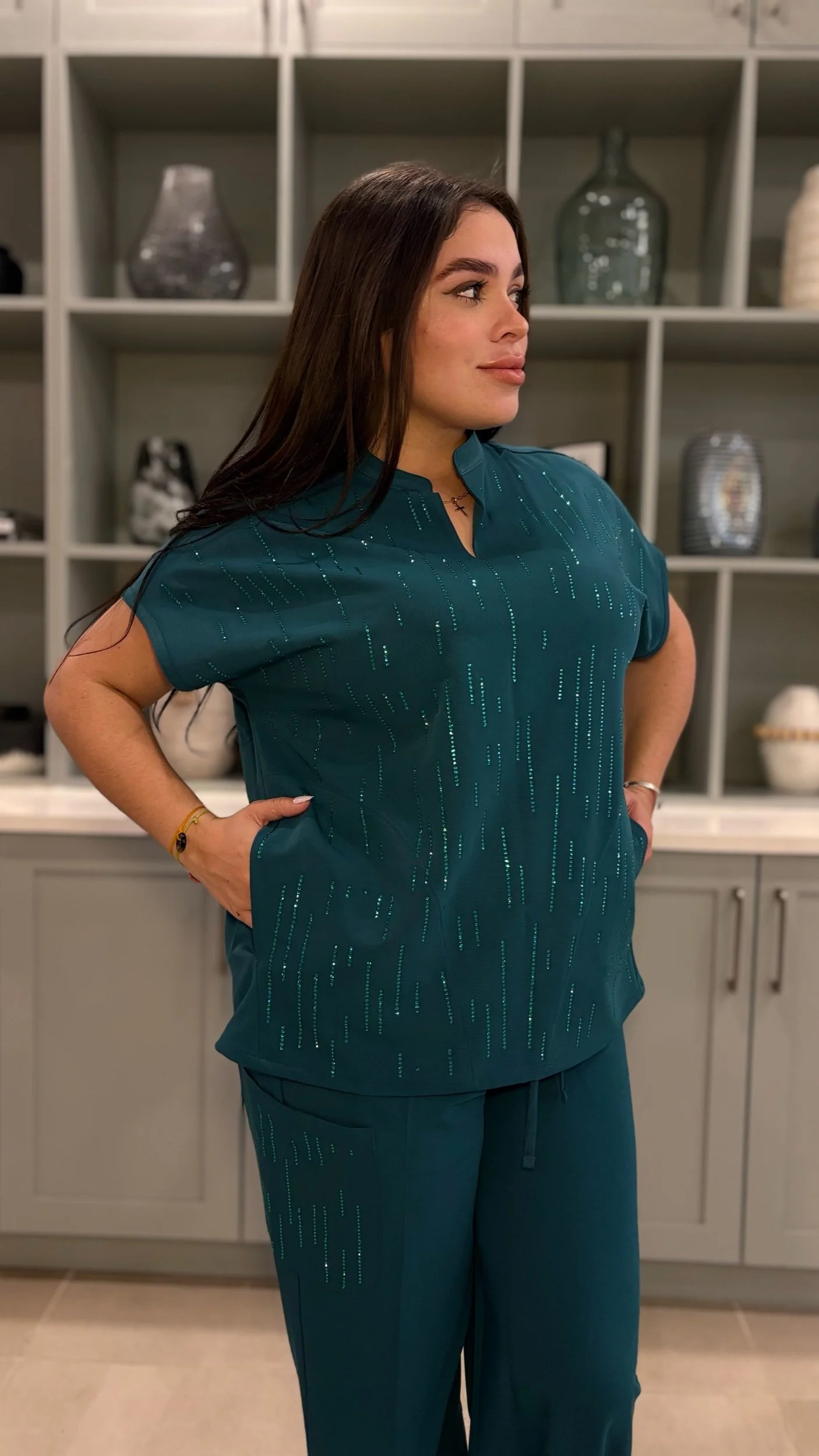 This set is crafted with hand-placed Austrian crystals, adding a touch of brilliance to every shift.Cut from spill resistant, four way stretch, breathable fabric. The fabric is spill proof, anti microbial, woven into fibers of the fabric thus maintaining the natural feel for lasting comfort, protects you against whatever life or your patient throws at you.
