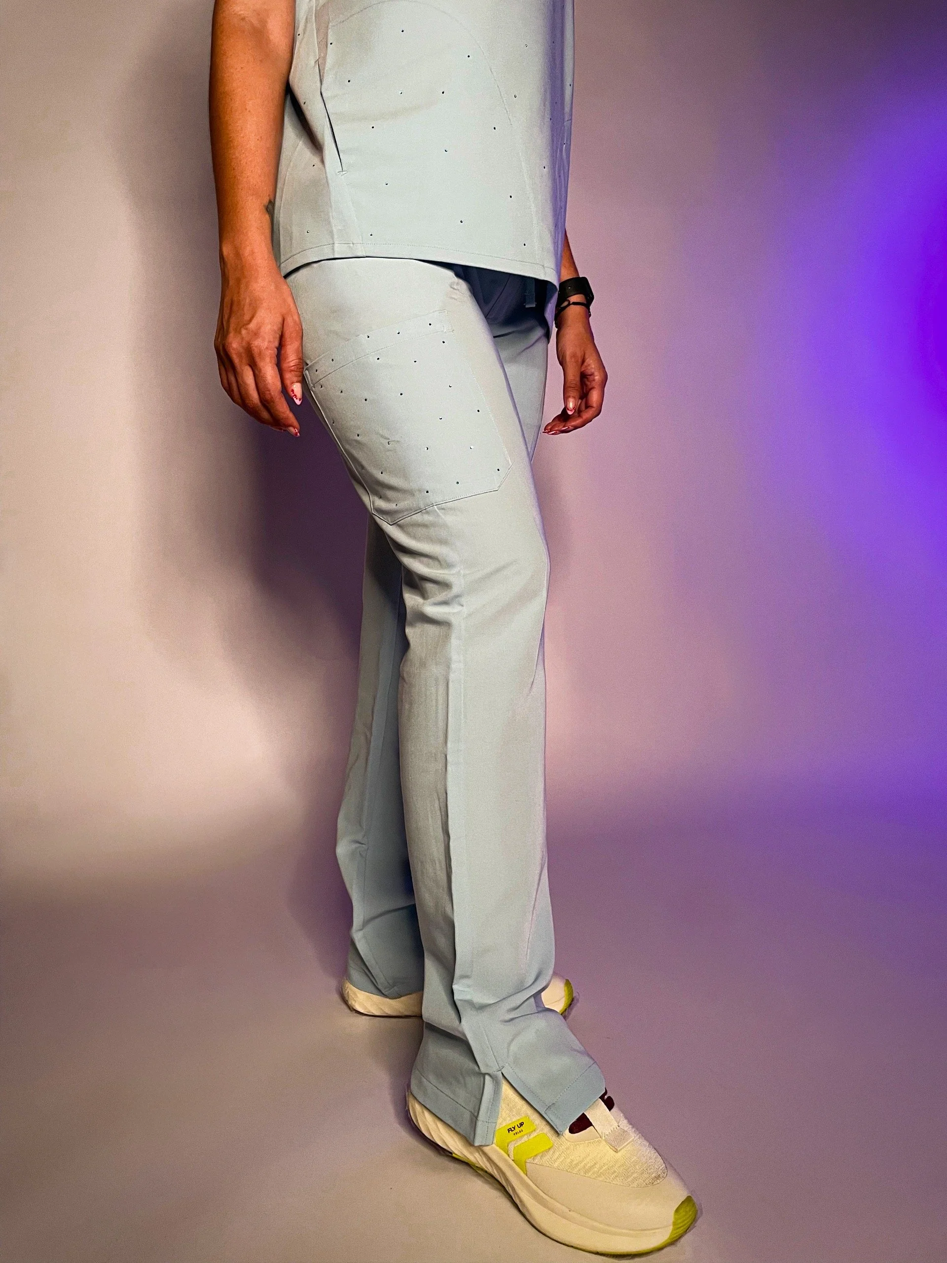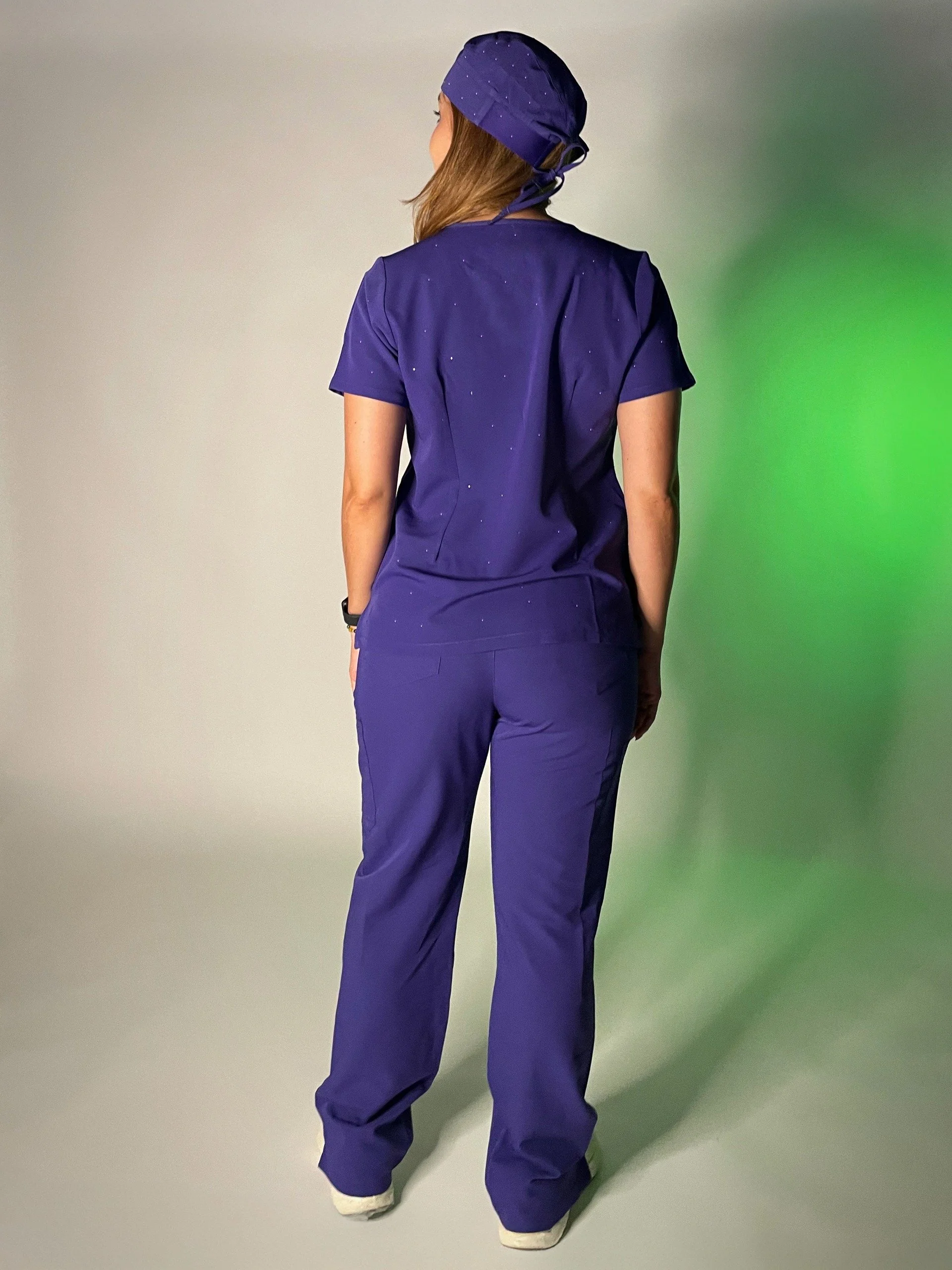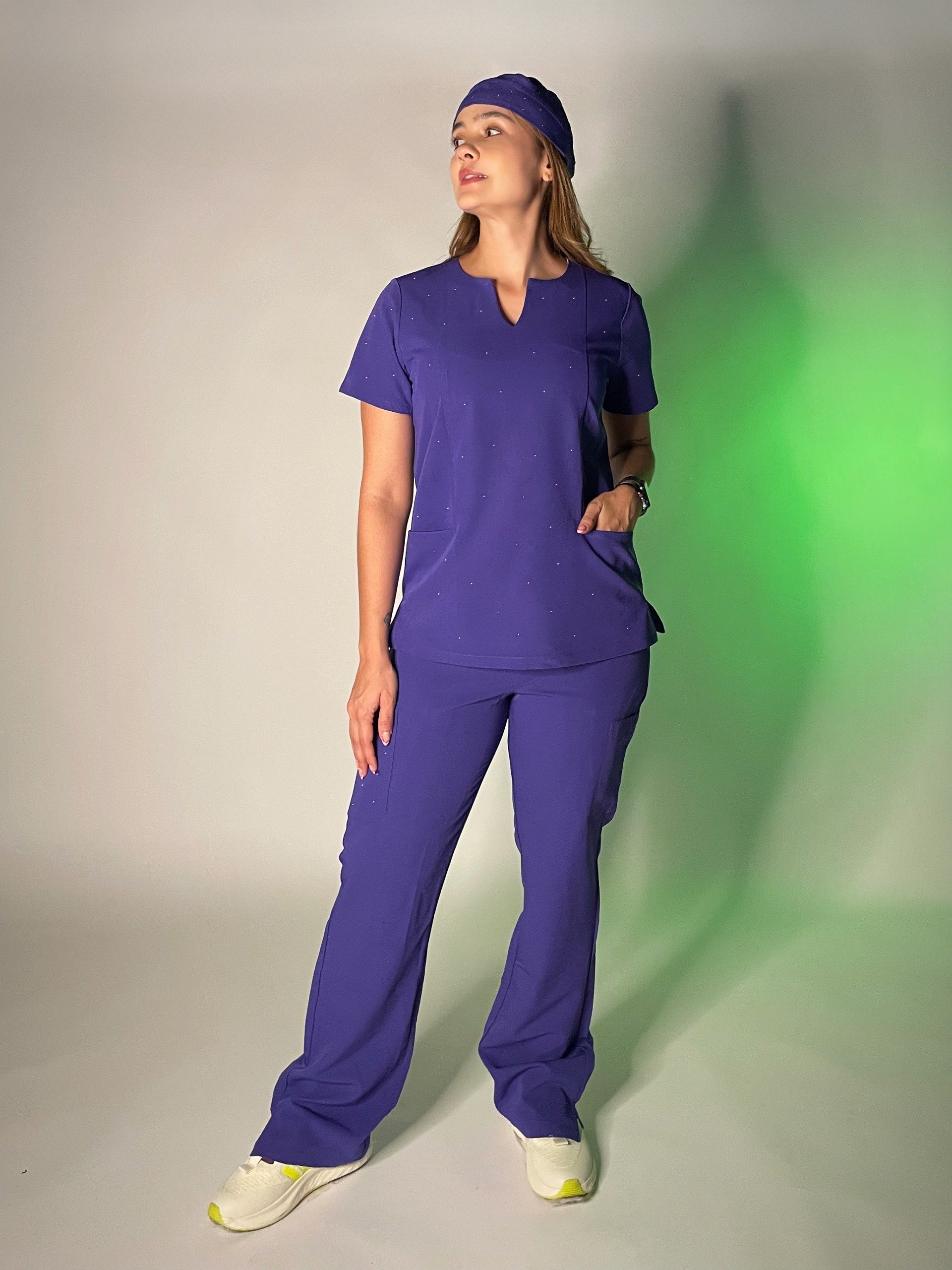 This set is crafted with hand-placed Australian crystals, adding a touch of brilliance to every shift.Cut from spill resistant, four way stretch, breathable fabric. The fabric is spill proof, anti microbial, woven into fibers of the fabric thus maintaining the natural feel for lasting comfort, protects you against whatever life or your patient throws at you.