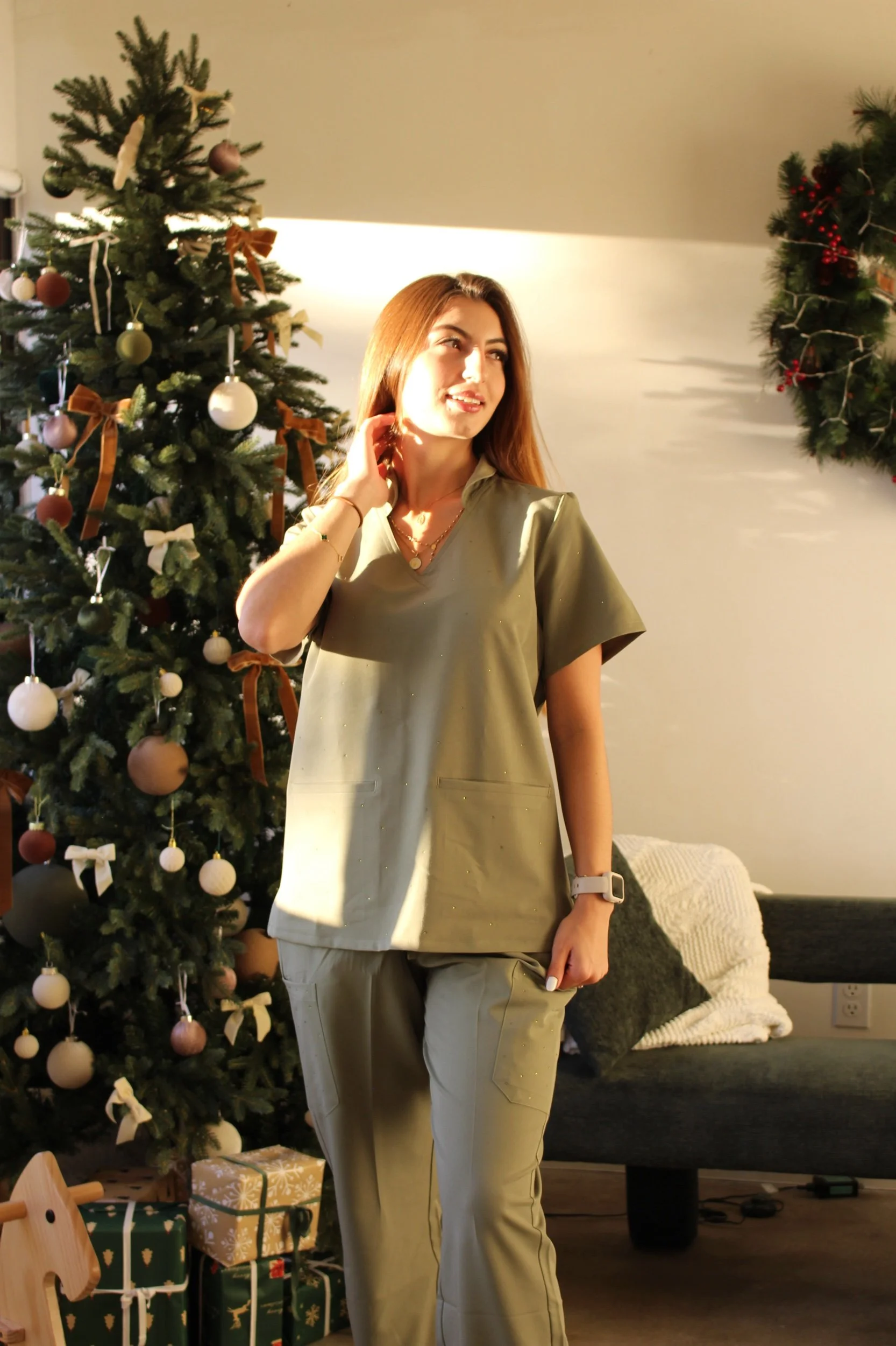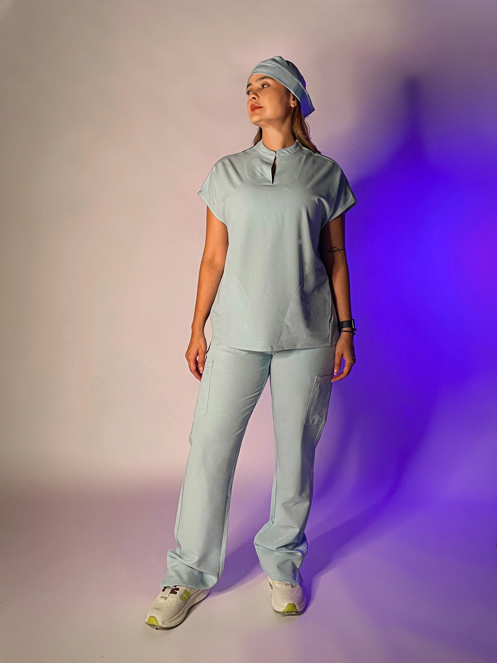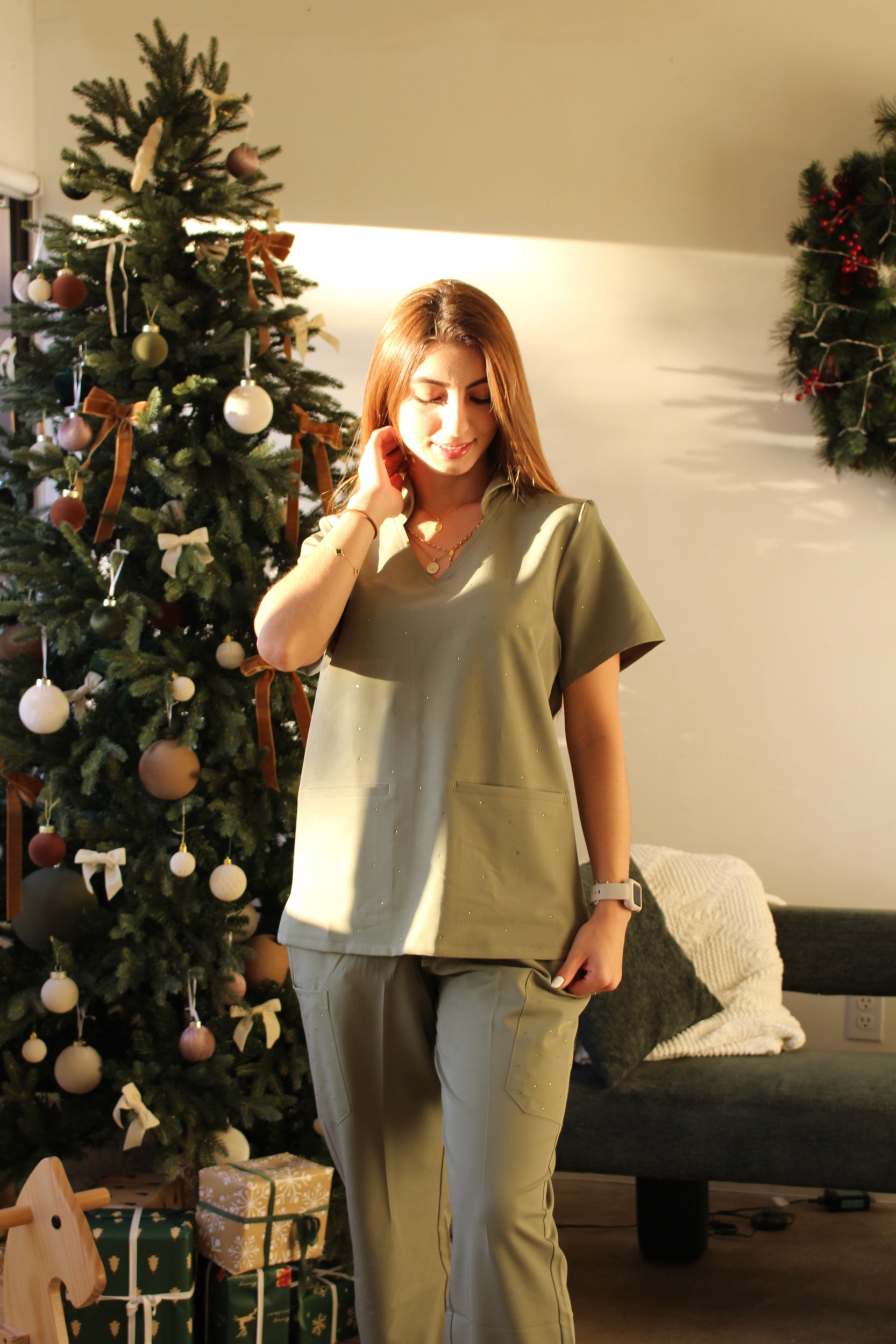 This set is crafted with hand-placed Australian crystals, adding a touch of brilliance to every shift.Cut from spill resistant, four way stretch, breathable fabric. The fabric is spill proof, anti microbial, woven into fibers of the fabric thus maintaining the natural feel for lasting comfort, protects you against whatever life or your patient throws at you.